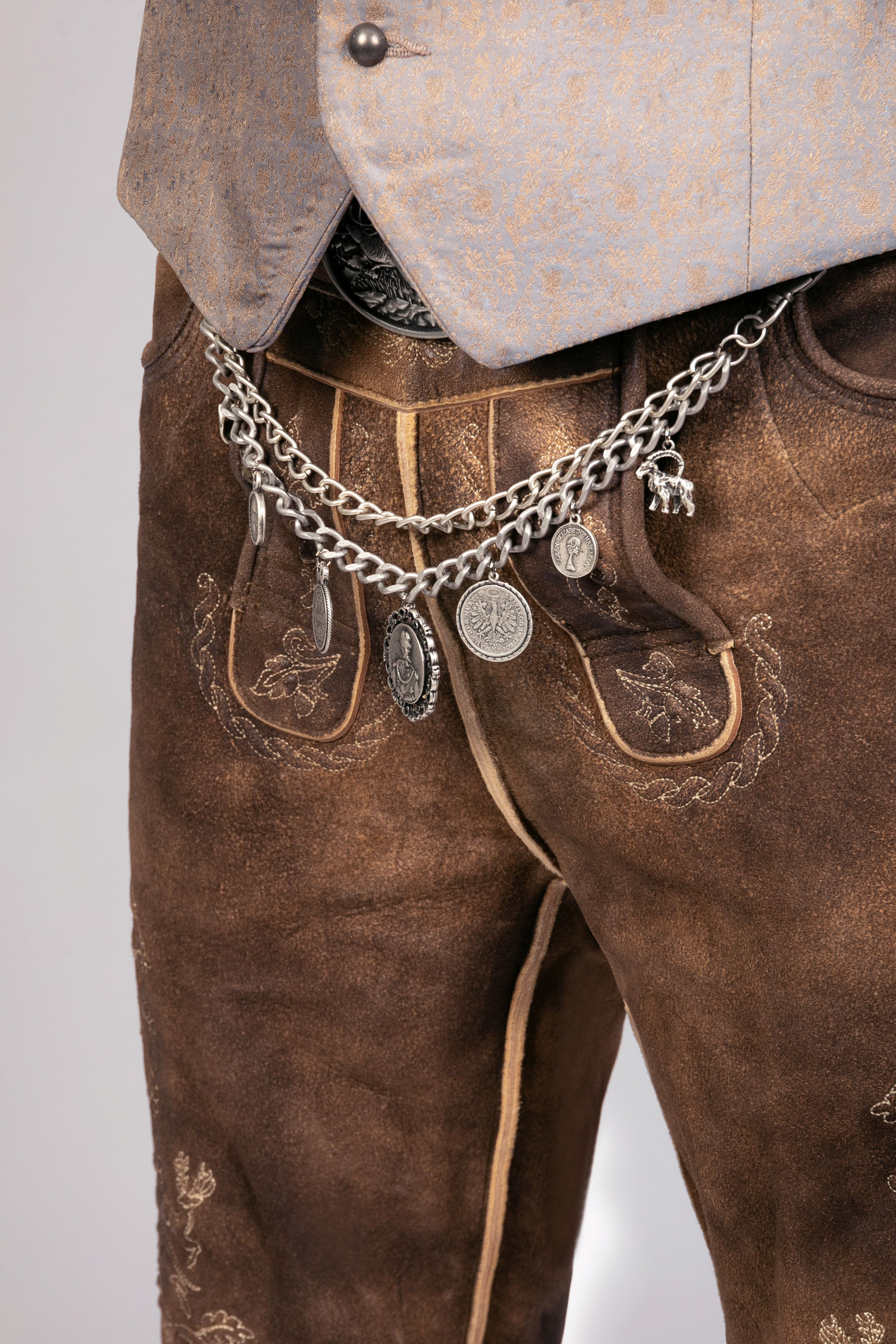Edles und zeitloses Lederhosen-Charivari mit fünf Münzen sowie einem Steinbock und Fuchs passend zu deiner Lederhose!