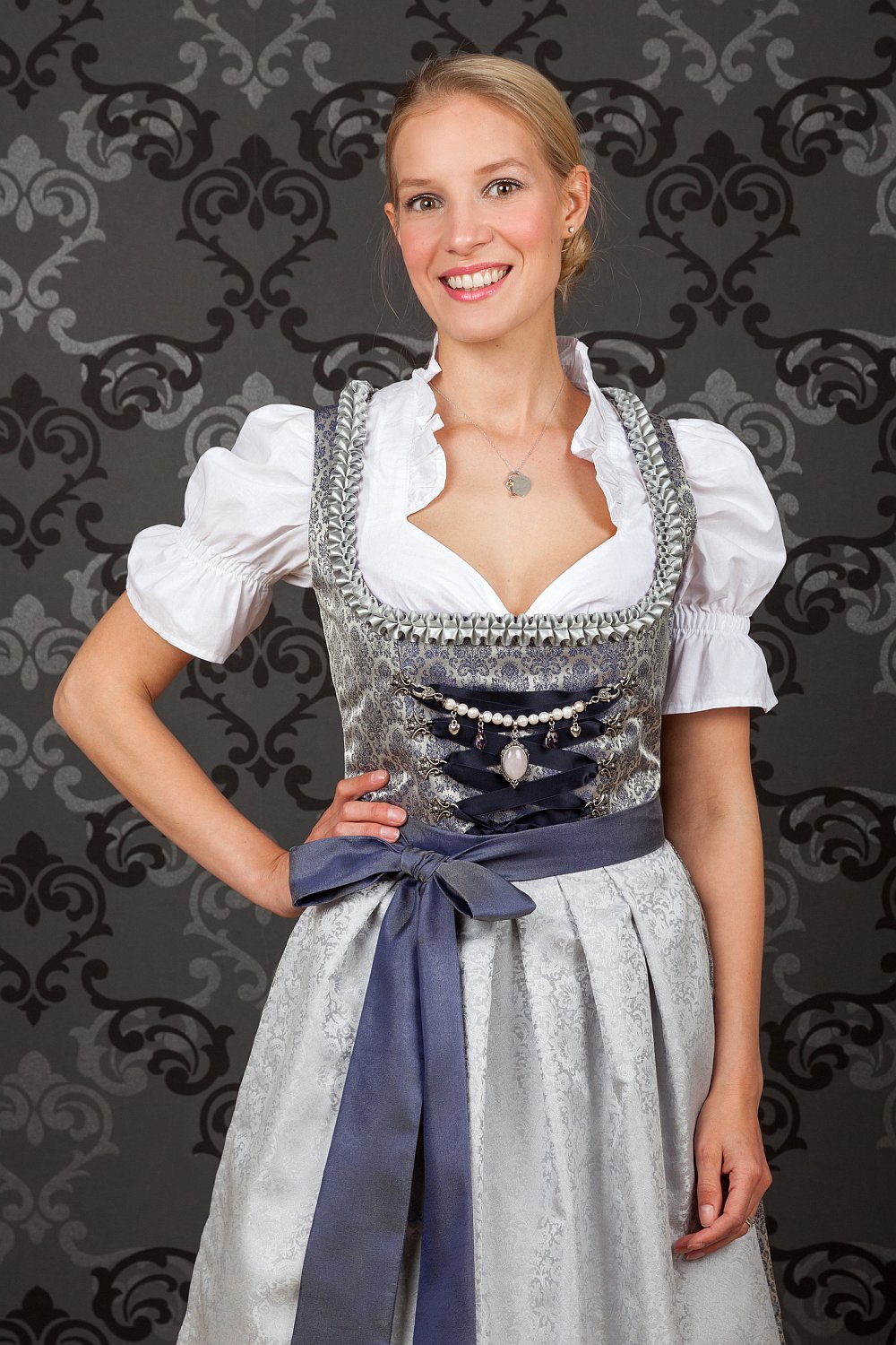 Die hellgraue Dirndlschürze in Spitzenoptik komplettiert den Couture-Look dieses besonderen Schmuckstücks.