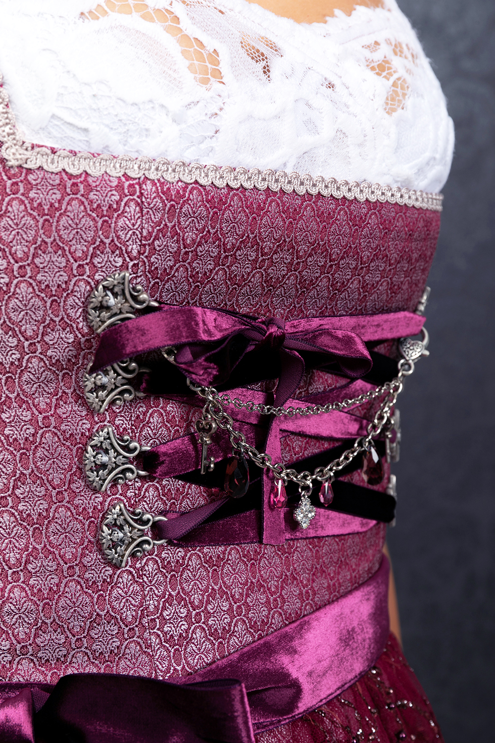 Der leichte Jacquard Stoff, aus dem das Dirndlkleid gefertigt ist, schimmert ebenfalls dezent in seinen Beeren- und grau/beigen Tönen.