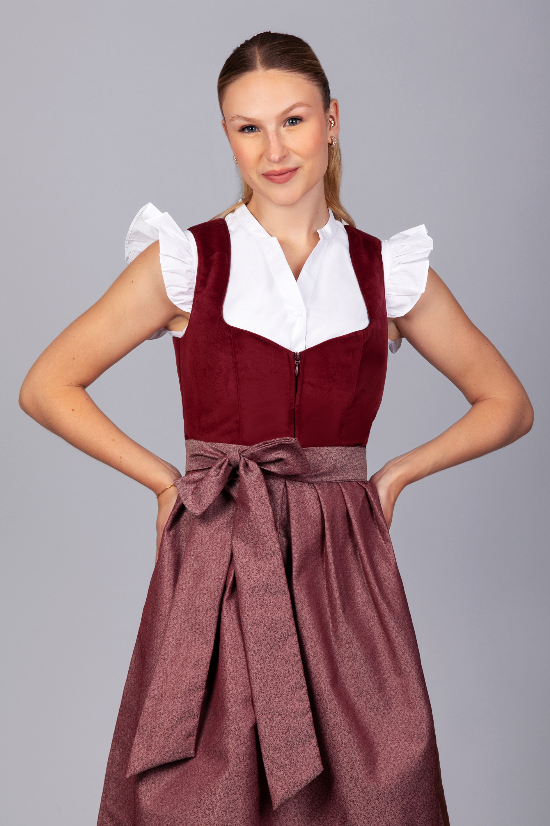 Ein Dirndl wie ein Statement – das Midi Dirndl Luise begeistert mit seinem edlen Samtmieder in sattem Bordeauxrot und einer zurückhaltend eleganten Gesamterscheinung. Der leicht glänzende Samtstoff bringt Tiefe und Klasse ins Design, während die feinen Brustnähte und der gerade Ausschnitt für eine schmeichelnde Silhouette und ein schönes Dekolleté sorgen.