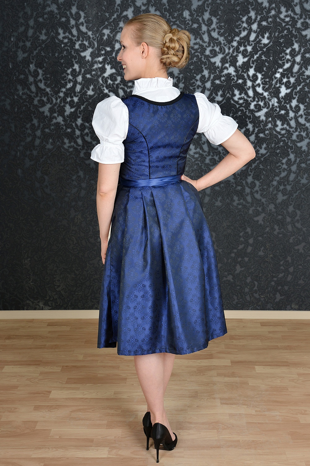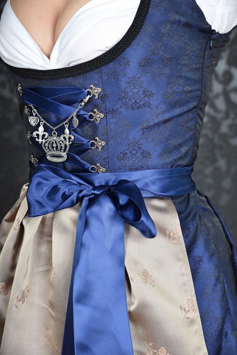 Der royalblaue Stoff des Kleides und die gold-glänzende Schürze ergeben ein faszinierendes Gesamtbild.